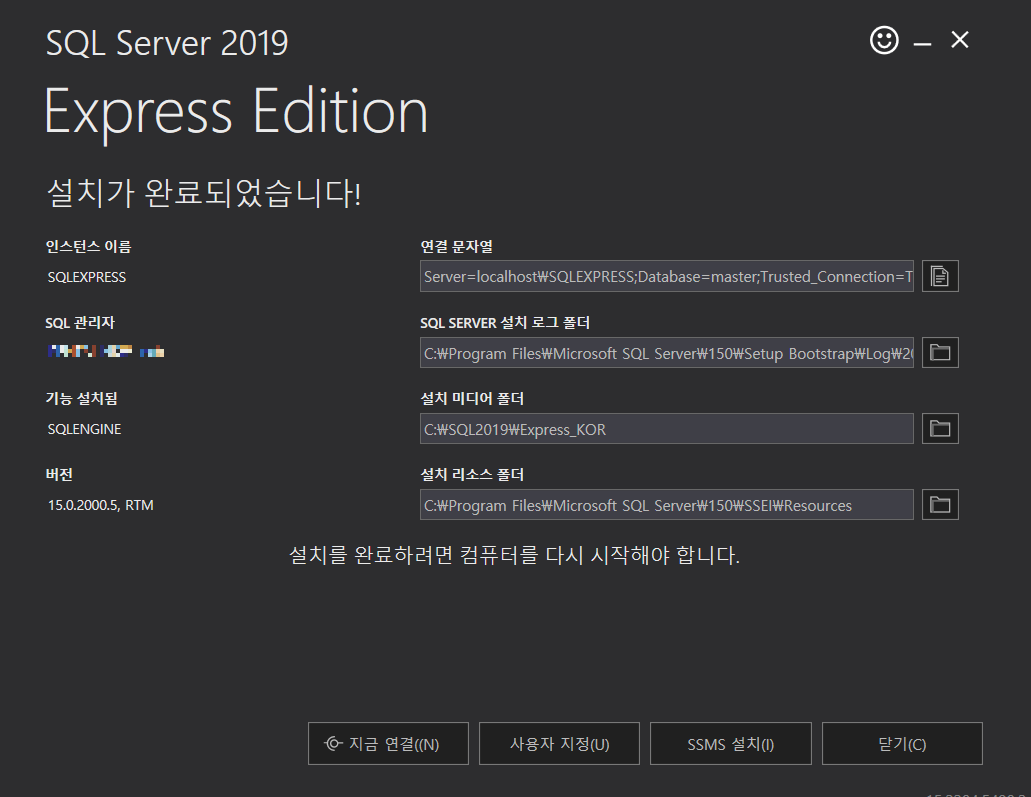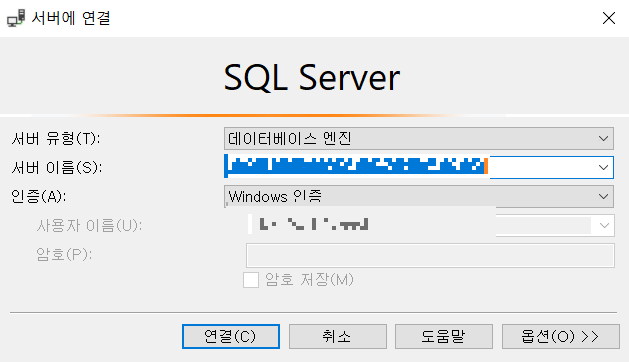 설치된 SSMS 를 실행하여 설치된 MSSQL 서버에 접속한다.