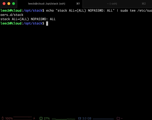 echo "stack ALL=(ALL) NOPASSWD: ALL" | sudo tee /etc/sudoers.d/stack