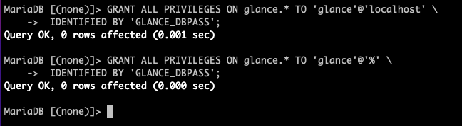 GRANT ALL PRIVILEGES ON glance.* TO 'glance'@'localhost' \