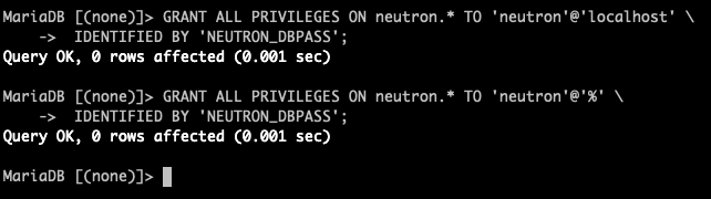 GRANT ALL PRIVILEGES ON neutron.* TO 'neutron'@'localhost' \
