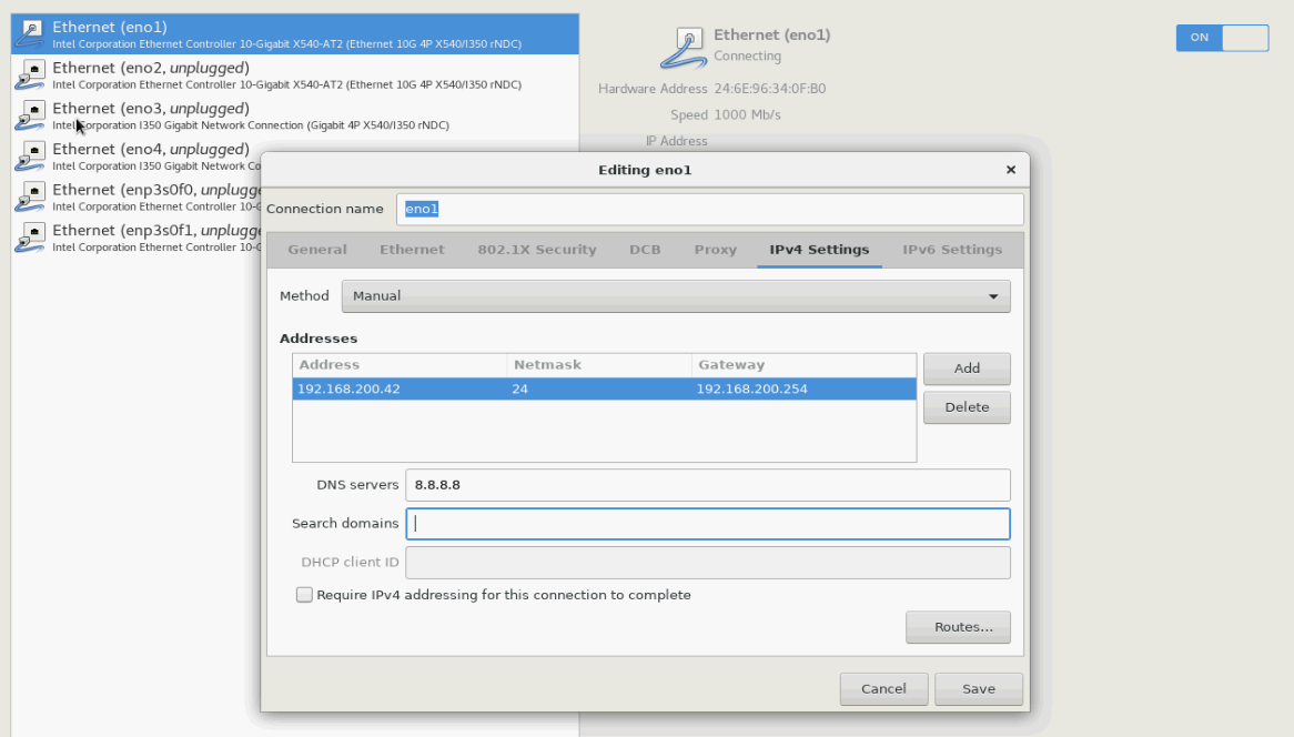 네트워크는 현재 eno1 포트에만 실제 물리포트를 물려놓았기 때문에 해당 포트만 ON 하고 아이피를 할당한다.