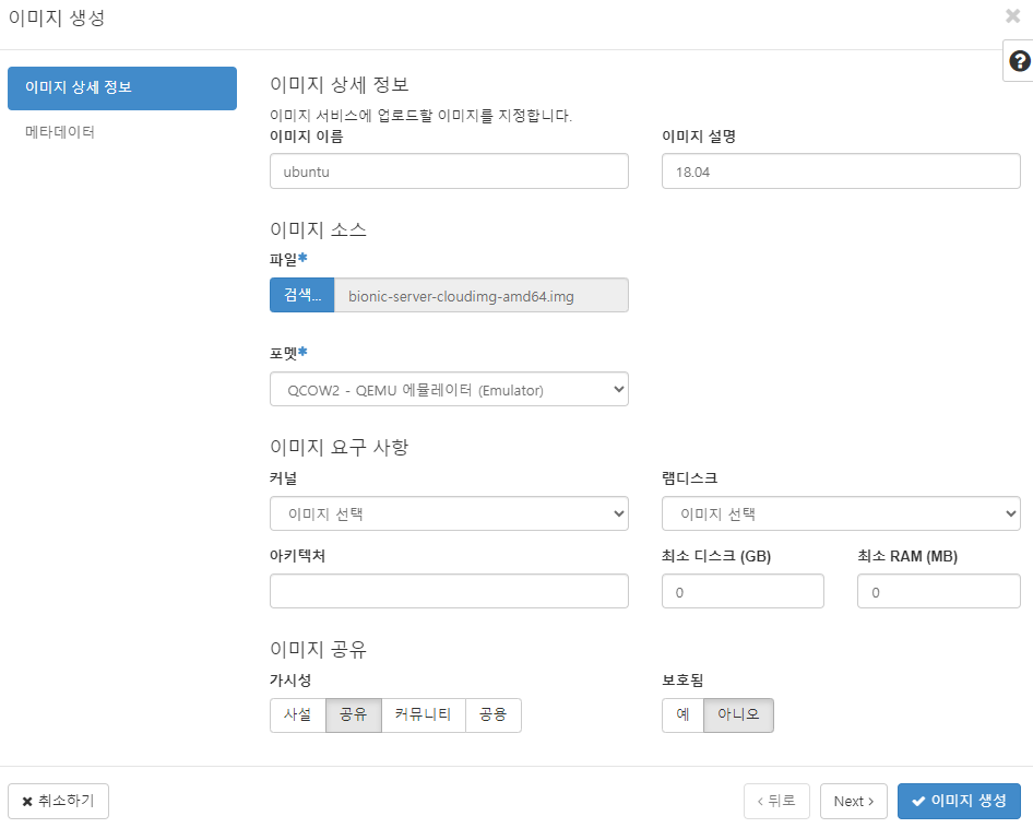 이번 포스팅에서는 ubuntu 이미지 파일을 다운받아 openstack 에 올리는 것을 전제로 진행한다.