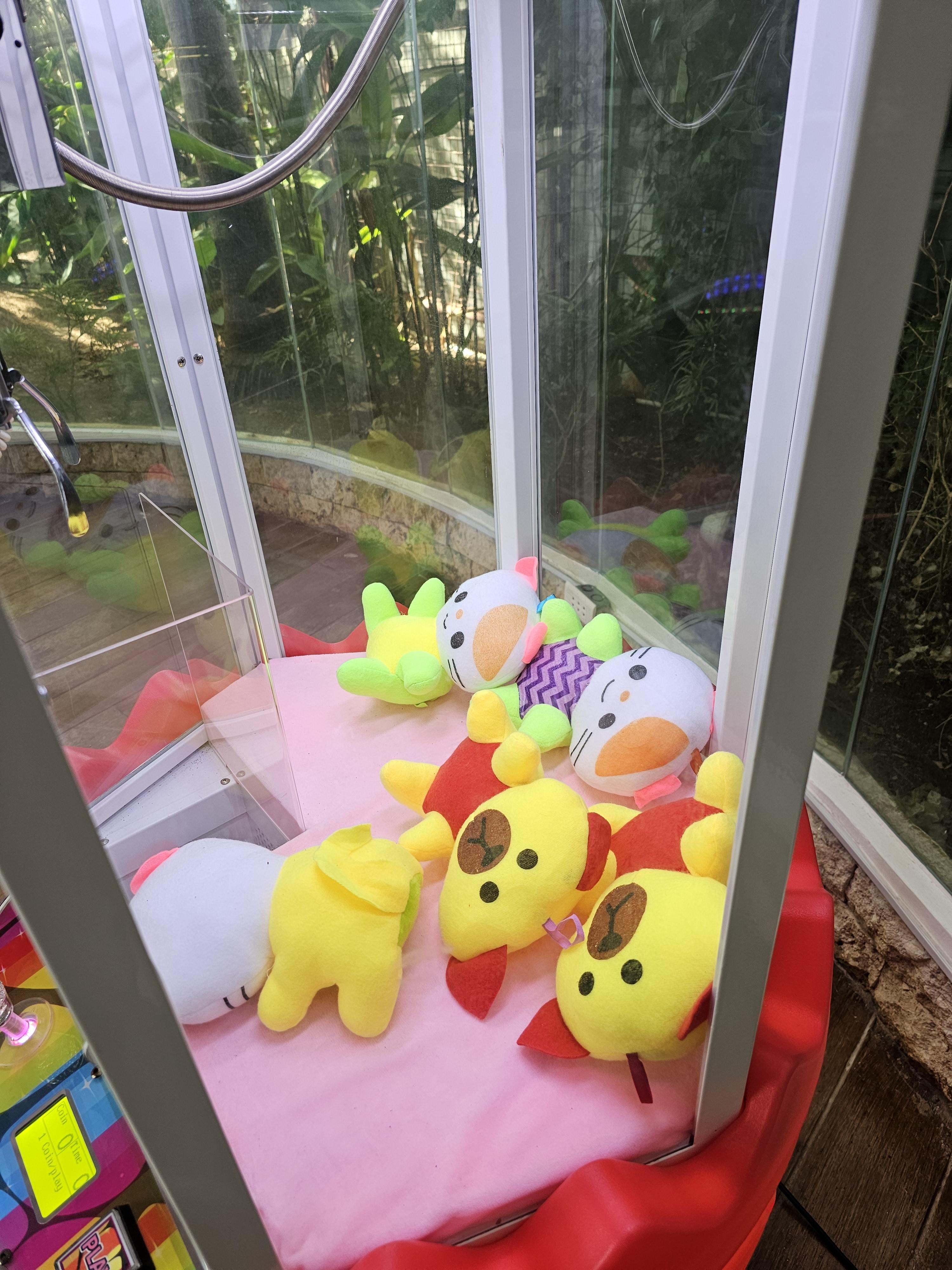 정체를 알 수 없는 부직포로 만든 것 같은 인형들이 들어있는 인형 뽑기 기계.